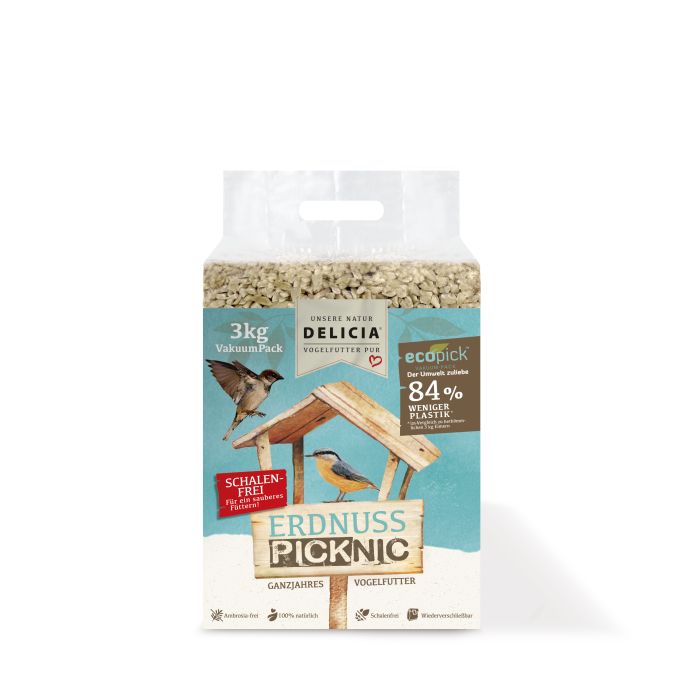 Ist die ideale Nahrungsergänzung für alle Gartenvogel-Arten, hergestellt aus hochwertigem Rohstoff, der für die Gartenvögel äußerst schmackhaft ist. Delicia Erdnuss Picknic ist komplett frei von Schalen und wird restlos von den Gartenvögeln aufgepickt. Ideal für die ganzjährige Fütterung auf dem Balkon, im Garten oder auf der Terrasse. Ohne Konservierungs-und Farbstoffe sowie künstliche Aromen. Bis zu 84% weniger Plastik im Vergleich zu herkömmlichen Eimerverpackungen. Zusammensetzung: Gehackte Erdnusskerne (Premiumqualität).