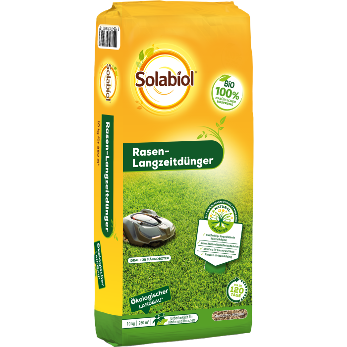 Mit dem Solabiol Rasen-Langzeitdünger werden die Rasengräser bis zu 120 Tage wohldosiert und ganz natürlich mit allen wichtigen Nährstoffen versorgt. Der zusätzlich enthaltene natürliche Wurzelaktivator sorgt dafür, dass die Rasenfläche gesund und kräftig bleibt und das Wurzelwachstum gefördert wird. Das Wurzelsystem bildet die Grundlage eines widerstandsfähigen Rasens, der gut mit Stresssituationen wie Trockenheit umgehen kann.