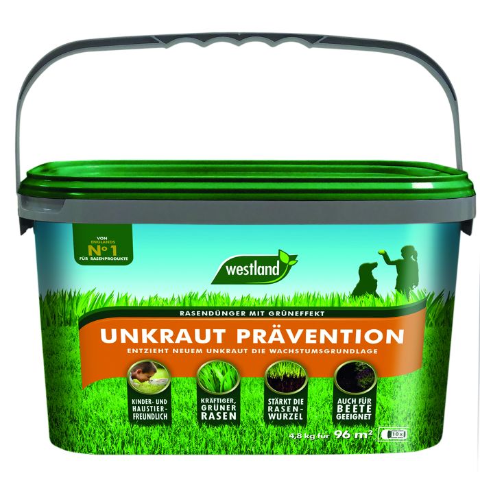 Westland Unkraut Prävention ist der ideale Rasendünger, wenn neuem Unkraut im Rasen und ständigem Jäten vorgebeugt werden soll. Ist das Unkraut in der etablierten Rasenfläche einmal entfernt, nimmt der natürliche und nitratfreie Dünger bereits nach einer Anwendung neuem Unkraut die Basis zum Wachsen. Durch die natürlichen Inhaltsstoffe erhält der Rasen einerseits ein sattes Grün, wird gestärkt und kann so Unkraut verdrängen, andererseits wird aufgrund der präventiven Wirkung einer Vielzahl an Unkräutern der Nährboden zur Keimung entzogen. Gleichzeitig hat die Ausbringung keinen negativen Effekt auf etablierte Pflanzen. Um das Einfliegen von Unkrautsamen aus angrenzenden Beeten in die Rasenfläche zu verhindern, kann Unkraut Prävention beispielsweise auch in den Beeten angewendet werden. Anwendungszeitraum: